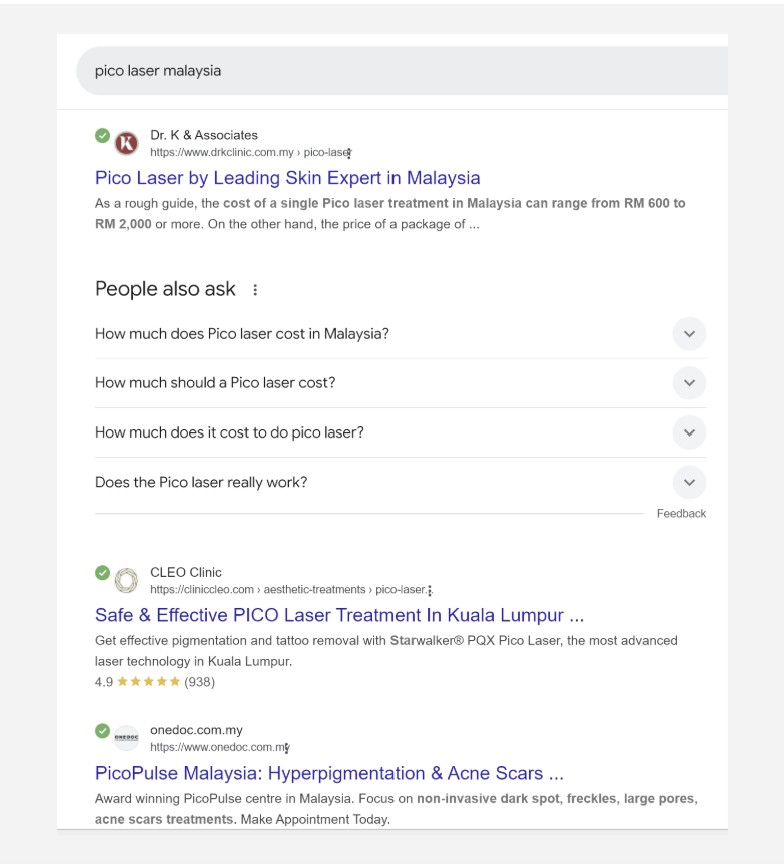 Dr K Clinic is ranked for popular keywords such as: pico laser malaysia, thread lift malaysia, prp treatment malaysia, dermal filler malaysia, eczema treatment malaysia, facial treatment malaysia, and other keywords.